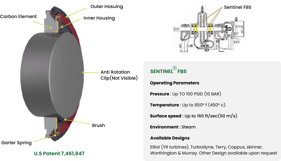 Enhance the performance of your process steam turbines by protecting the carbon rings with the Inpro/Seal Sentinel Floating Brush Seal (FBS). The Sentinel FBS is comprised of densely packed and flexible metallic bristles which “bend” with changing clearances between rotating and stationary surfaces. This unique technology, first applied in jet engines where high temperature differentials demand the need for a compliant and reliable seal, provides an extra layer of protection that slows down the natural wear of downstream carbon rings.